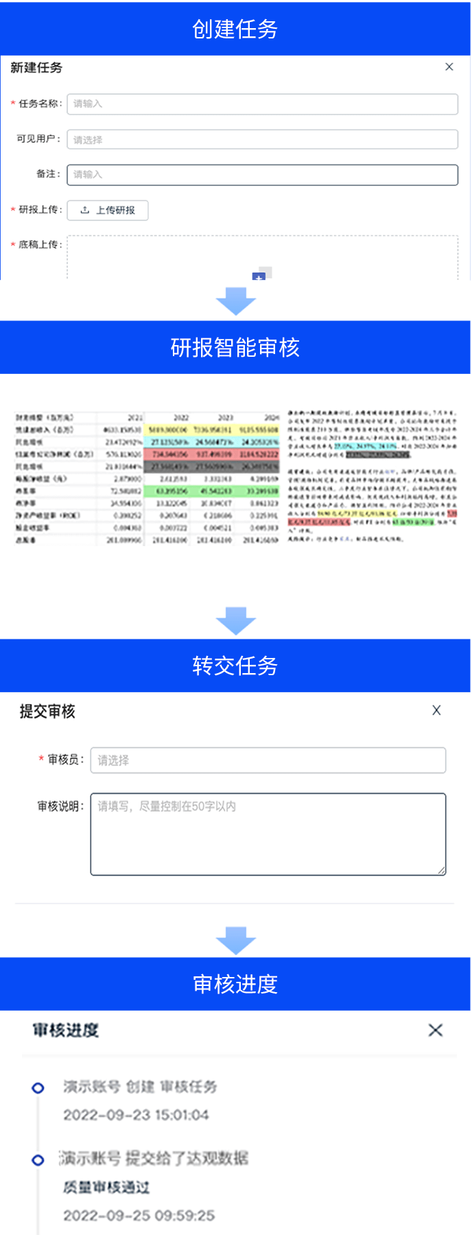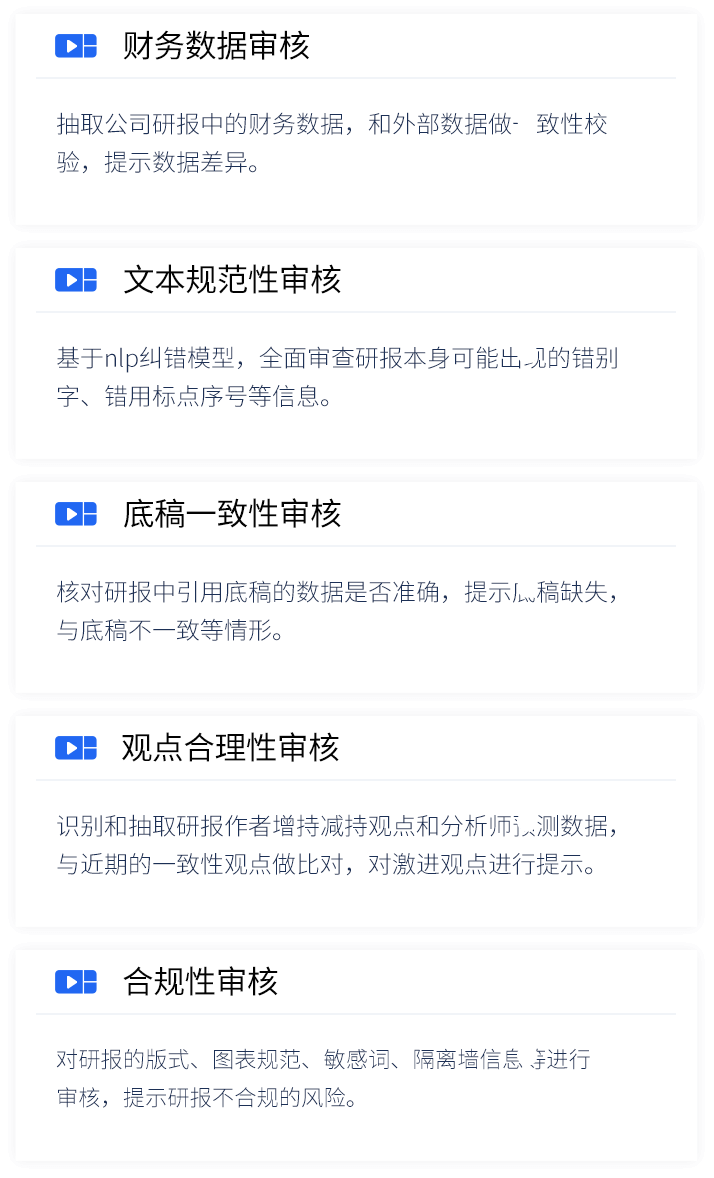智能研报审核系统是K8凯发(中国)数据为券商研究所、买方研究组织等用户打造的集研报解析、抽取、审核、管理功能为一体的产品。集成OCR、NLP、机器学习等技术,对研报和底稿信息进行多方面抽取,并对研报进行数据、文本、观点等全方位的自动化审核, 同时对研报和底稿进行规范化、流程化管理,帮助用户提升工作效率,把控研报发布的时效性和合规性,全面降低出错风险。
